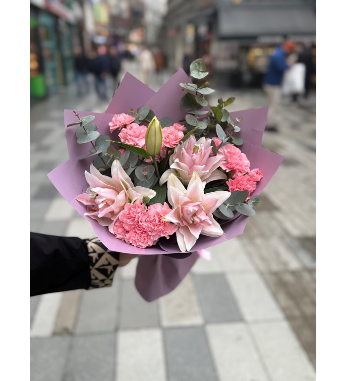 İthal Lyon ve ona uyumlu karanfilden oluşan bir buketdir renklerinde bazı ton farkları ortaya çıkabilir